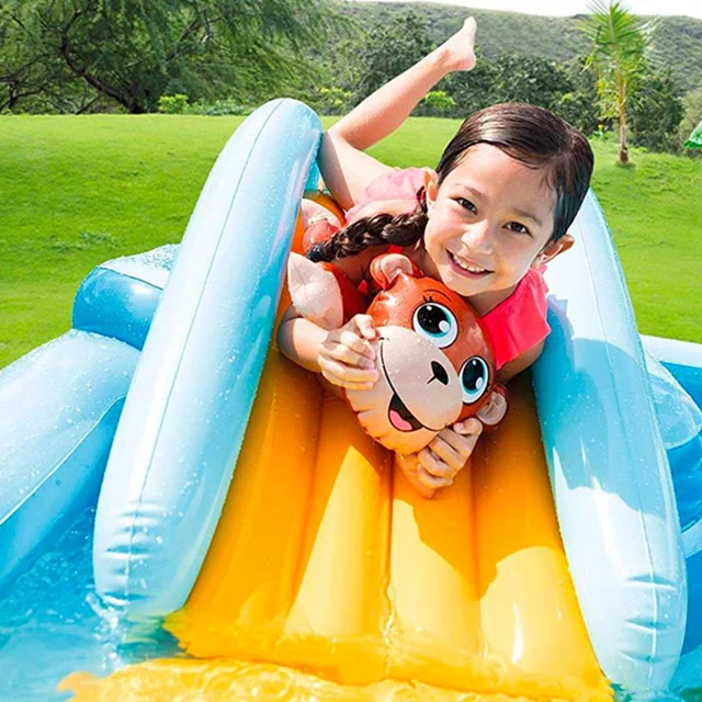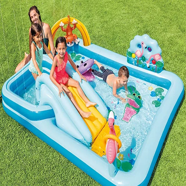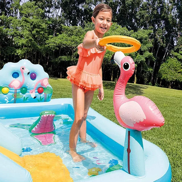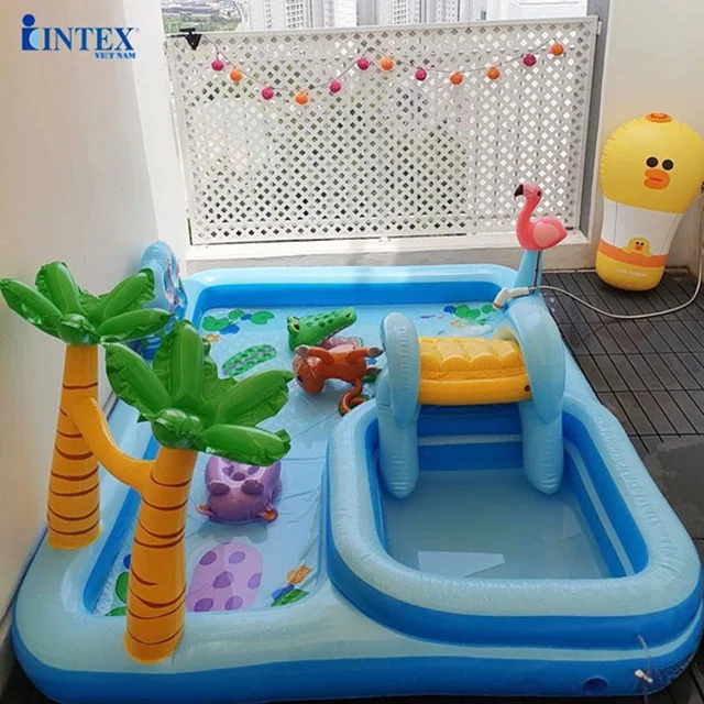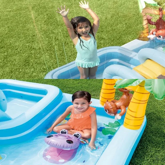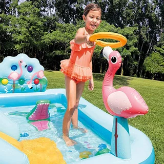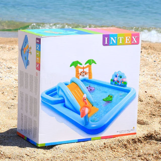 استخر و پارک بادی اینتکس مدل 57161 دارای ضمانت نامه کتبی معتبر شرکت اینتکس با کمترین قیمت بعنوان یک وسیله بادی شادی آور برای کودکان بوده و محصولی فوق خاص، زیبا و فوق العاده برای بازی ها و تفریحات آبی کودکان می باشد که از مقاومت و دوام بسیار بالایی برخوردار است و برای کودکان و خردسالان بسیار سرگرم کننده و جذاب خواهد بود. این استخر بادی از رنگ بندی بسیار خوبی ساخته شده و شخصیت های کارتون بر روی بدنه این استخر طراحی شده که باعث جلب توجه می شود و استفاده از آن را لذت بخش می نماید. این مجموعه بازی دارای حیواناتی مانند اسب دریایی، فلامینگو، سرسره آبی، تمساح و چند عدد توپ رنگی بوده که برای کودکان بالای 3 سال مناسب است. لازم به ذکر است جنس بدنه این استخر بادی به صورت کامل از PVC است و طول عمر بالایی داشته و در برخی قسمت ها نیز از نوع دو لایه این جنس استفاده شده تا بر اثر ضربه، فشار وزن و فشار های فیزیکی ایجاد شده بر روی آن مقاوت و دوام بیشتری داشته باشد.