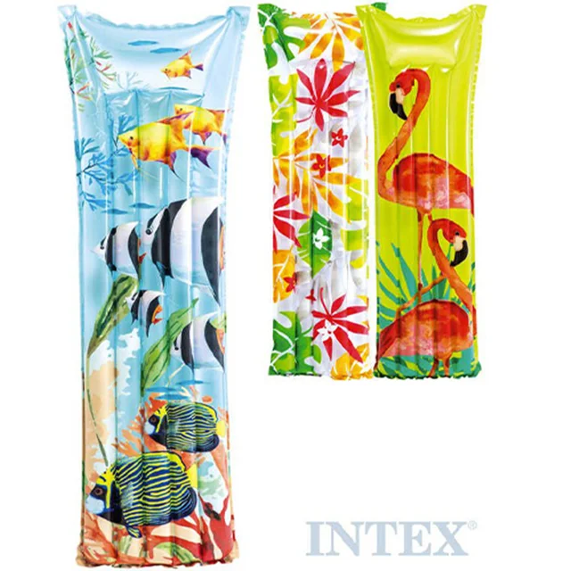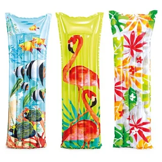 تشک بادی روی آب مدل 59720 طرح 2019 از جمله محصولات سال جدید از شرکت اینتکس بوده که برای آب های آرام و استخر های خانگی گزینه بسیار مناسبی می باشد. این محصول دارای سه نوع طراحی زیبا و متفاوت فلامینگو، برگ و ماهی بوده که بر جذابیت آن افزوده است. لازم به ذکر است جنس آن از نوع وینیل دو لایه بوده که می توان گفت وینیل یکی از بهترین مواد برای تولید محصولات بادی و به ویژه تشک های بادی می باشد و بسیاری از تولیدکنندگان مطرح دنیا از این جنس در تولیدات خود استفاده می کنند. قسمت رویه این تشک بادی از طرح چرم بوده که زیبایی چشمگیری به آن داده است و همچنین قسمت کف این تشک نیز از دولایه ضخیم وینیل برای مقاومت هرچه بیشتر ساخته شده است.
