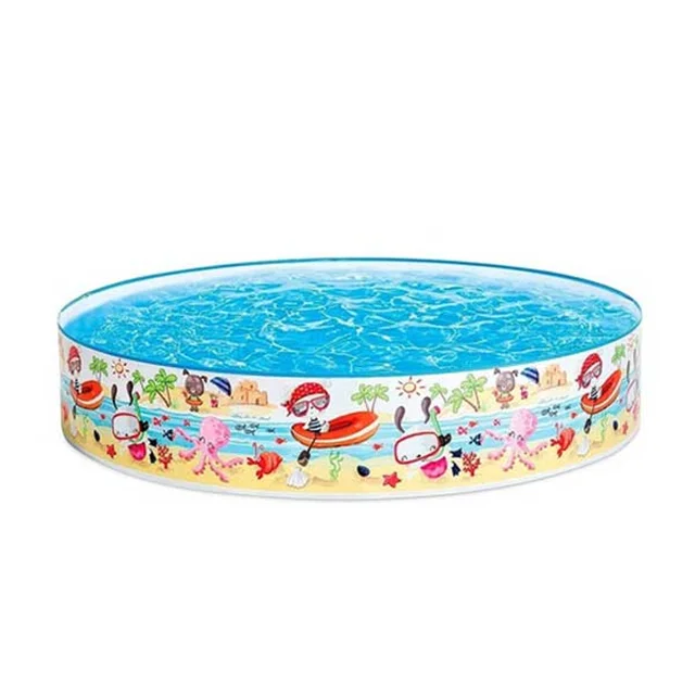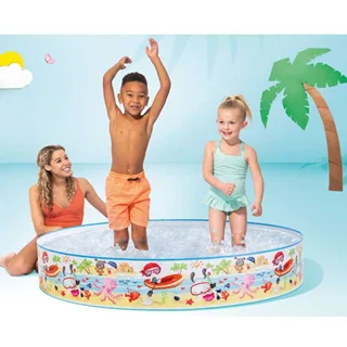 استخر طلقی اینتکس مناسب برای استفاده 2 کودک بالای 3 سال می باشد.رنگ دیواره داخلی آن سفید و رنگ کف محصول آبی ساده می باشد.روی دیواره ی خارجی استخر طلقی تصاویری از گیاهان دریایی و حیوانات دریایی بصورت انیمیشن طراحی شده.وجود این اشکال با تنوع رنگ نسبتا شاد برای کودکان بسیار جذاب و لذت بخش می باشد.جهت استفاده بهینه از این محصول دقت فرمایید برای جلوگیری از آسیب دیدن از ناحیه ی کف استخر،یک زیر انداز یا کف پوش مناسب در نظر بگیرید تا از تماس مستقیم استخر با سطح زمین جلوگیری شود.
