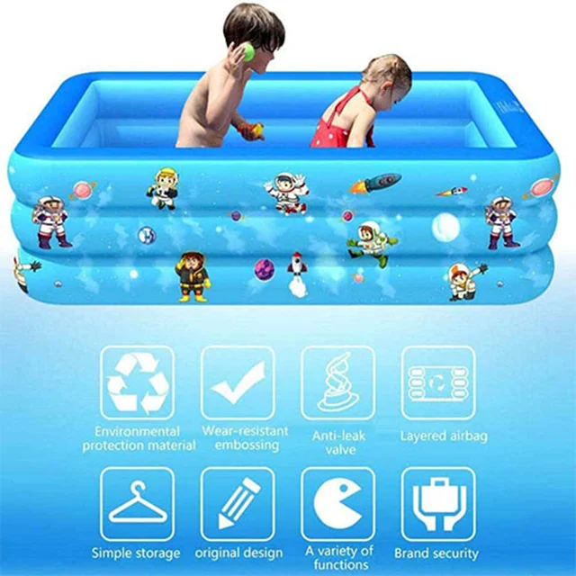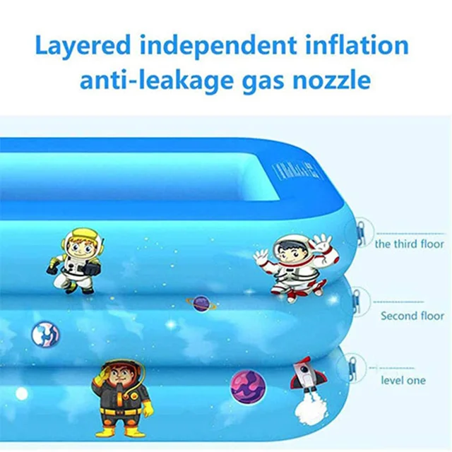 استخر آبی رنگ طرح فضایی به صورت مستطیلی ساخته شده، ابعاد بسیار مناسب استاندارد این کالا استفاده از آن را برای سنین کودکان بسیار ساده کرده است. رده سنی که برای این استخر در نظر گرفته شده است. بخش دیواره های این استخر و کفی آن بصورت بادی ساخته شده تا کودک عزیز شما بتواند به راحتی برروی آن بنشیند و بازی کند بدون آن که کوچکترین خستگی و اذیتی را احساس کند. البته بخش دیواره های استخر دارای طراحی سه لایه است تا در برابر وزن آب دوام بهتری داشته باشد. لازم به ذکر است هر یک از لایه ها به صورت مجزا راه اندازی شده و دریچه باد جداگانه ای دارد. بخش خارجی بدنه به صورت طرح دار بوده که شبیه طرح های انیمیشن های فضایی می باشد. بخش داخلی استخر نیز آبی است که آب را زیبا تر و آبی تر نشان دهد.