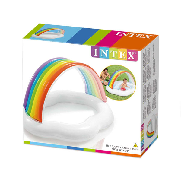 استخر بادی رنگین کمان یکی از محصولات متنوع شرکت اینتکس می باشد که با کد 57141 در میان محصولات معرفی می گردد. استخر بادی رنگین کمان ساخته شده از وینیل و دارای دو دریچه باد مجزا می باشد. در بالای استخر یک کمان حلالی شکل تعبیه شده که دارای طیف رنگی جذاب برای کودکان می باشد. ابعاد استخر به گونه ای تعبیه شده که مناسب برای استفاده کودکان 1 الی 3 سال کاملا مناسب می باشد. کف استخر ساده بوده و در صورتی که بخواهید از استخر بادی رنگین کمان به عنوان استخر توپ استفاده نمایید حتما سعی کنید برای زیر آن از یک زیر انداز نرم و مناسب استفاده نمایید. جهت حفظ ایمنی حتما سعی شود برای باد کردن محصول از پمپ بادهای مخصوص همین شرکت استفاده شود و به هیچ عنوان از کمپرسورهای باد متفرقه استفاده ننمایید.