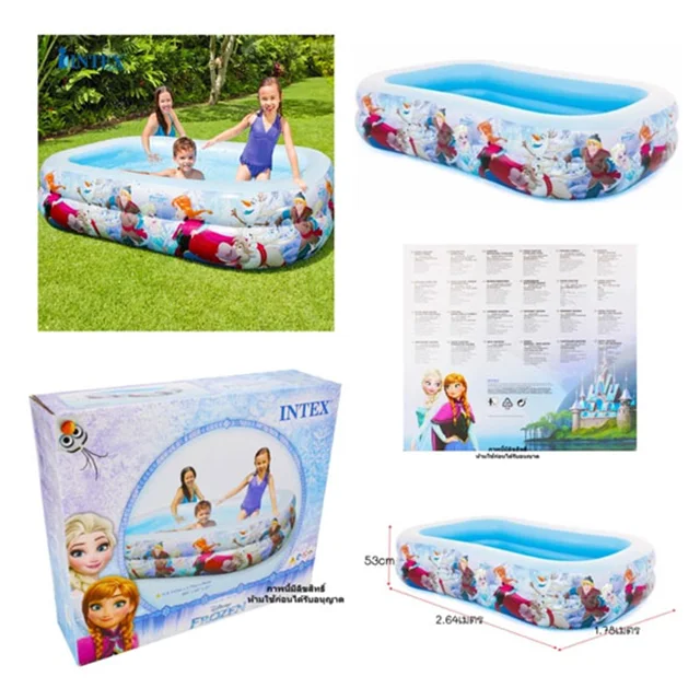 این استخر زیبا دارای بدنه ای به شکل مستطیل می باشد که دارای لبه های منحنی است. کف استخر و دیواره داخلی آن به رنگ آبی می باشد. بدنه بیرونی آن برگرفته از انیمیشن زیبای Frozen است که بی شک تمام دختران به آن علاقه دارند. طراحی به شکل شخصیت های انیمیشن یک طراحی خاص بوده که تمامی کودکان به شخصیت های انیمیشنی علاقه نشان می دهند. بر روی بدنه بیرونی این استخر کودک اینتکس شخصیت های اصلی انیمیشن Frozen دیده می شود. که کودک با دیدن آن شگفت زده خواهد شد. دیواره این استخر از داخل دو تکه می شود که به استحکام بیش تر آن کمک می کند.