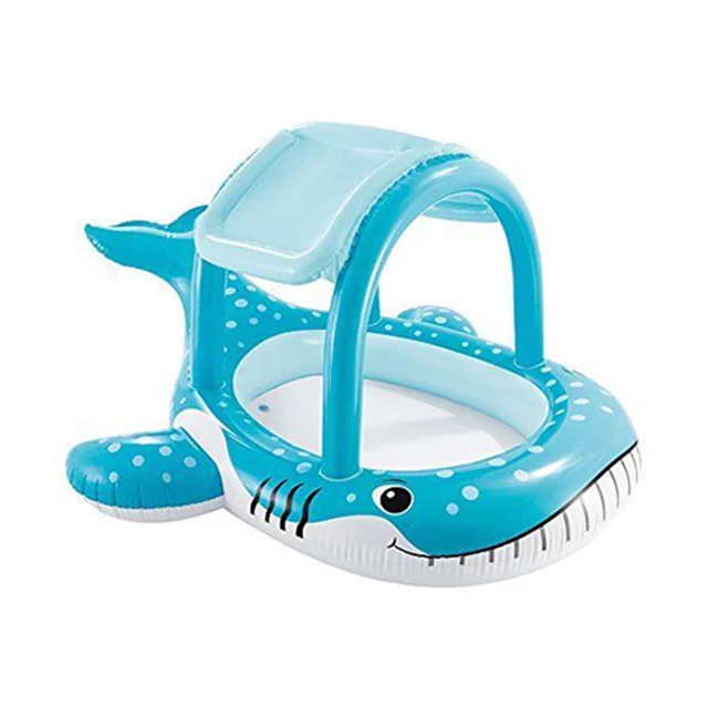 علاوه بر این موارد باید در خصوص امکانت این استخر هم با شما صحبت کنیم. شما می توانید مشاهده کنید که این استخر بادی کودک دارای یک عدد سایبان بادی می باشد که این ناحیه باعث شده تا در فصول گرم سال به هیج عنوان نور خورشید ، کودک شما را اذیت نکند. در واقع بدون نگرانی از این حیث شما می توانید این محصول را در هر فضا و شرایطی راه اندازی نمایید. در کنار این موارد طراحی باله های این حیوان نیز در هر سه سمت این استخر از دیگر خصوصیات فوق العاده ظاهری این محصول به شمار می رود که قطعا نسبت به محصولات ساده از این حیث پیشرو خواهد بود.
