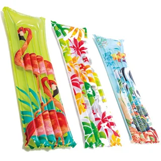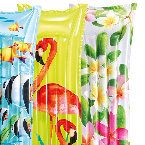 تشک بادی روی آب مدل 59720 طرح 2019 از جمله محصولات سال جدید از شرکت اینتکس بوده که برای آب های آرام و استخر های خانگی گزینه بسیار مناسبی می باشد. این محصول دارای سه نوع طراحی زیبا و متفاوت فلامینگو، برگ و ماهی بوده که بر جذابیت آن افزوده است. لازم به ذکر است جنس آن از نوع وینیل دو لایه بوده که می توان گفت وینیل یکی از بهترین مواد برای تولید محصولات بادی و به ویژه تشک های بادی می باشد و بسیاری از تولیدکنندگان مطرح دنیا از این جنس در تولیدات خود استفاده می کنند. قسمت رویه این تشک بادی از طرح چرم بوده که زیبایی چشمگیری به آن داده است و همچنین قسمت کف این تشک نیز از دولایه ضخیم وینیل برای مقاومت هرچه بیشتر ساخته شده است.